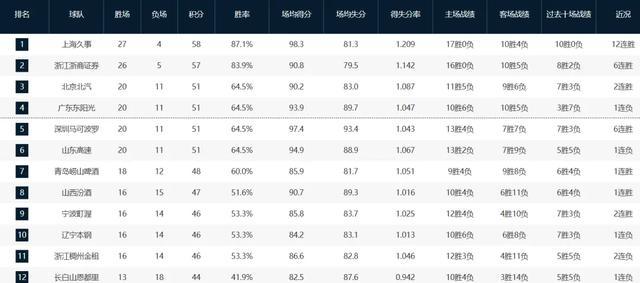 本赛季至今,广东队以20胜11负排名联盟第四,排在他们前面的分别是上海队(27-4)、卫冕冠军广厦队(26-5)和北京队(20-11)。