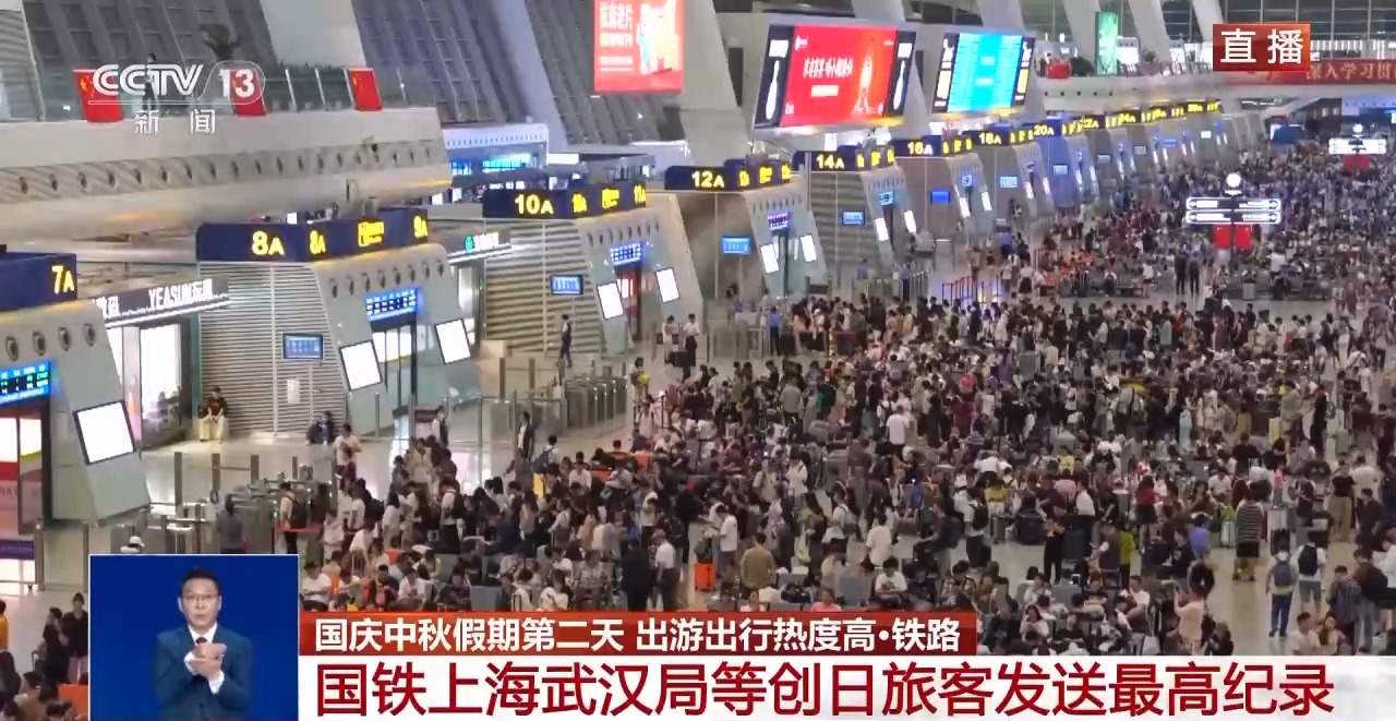 总台央视记者 陈俏:从国铁集团今天发布的数据看,今年国庆、中秋假期首日,包括国铁上海局和国铁广州局等,全国部分重点地区的铁路客运,都刷新了单日旅客发送的历史纪录。